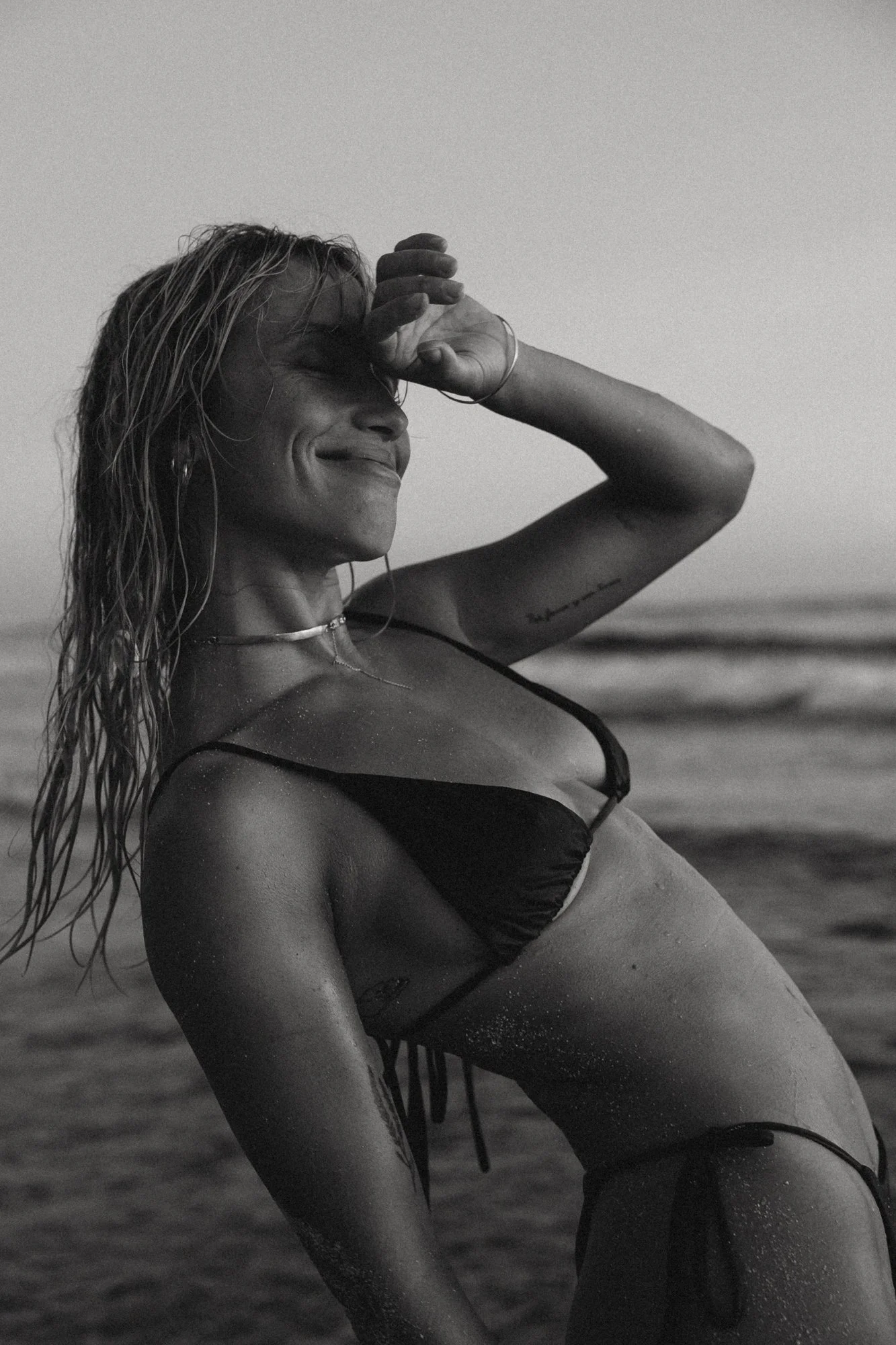 Close-up of a person wearing a black bikini at the beach, holding sunglasses, with water droplets on their skin and background of the ocean.