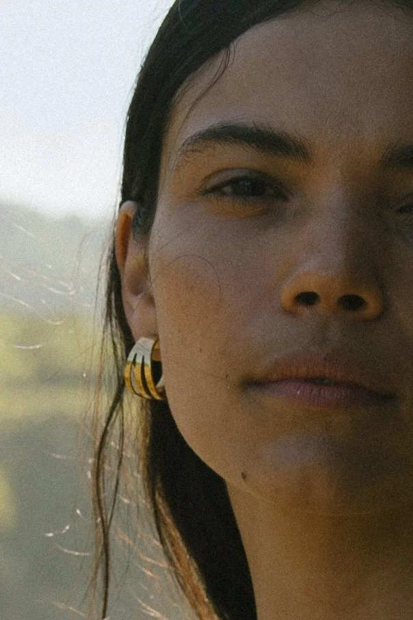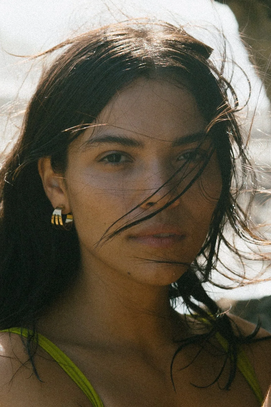 Close-up of a young woman's face with dark hair, wearing a hoop earring with black and yellow stripes, outdoors with a blurred background.
