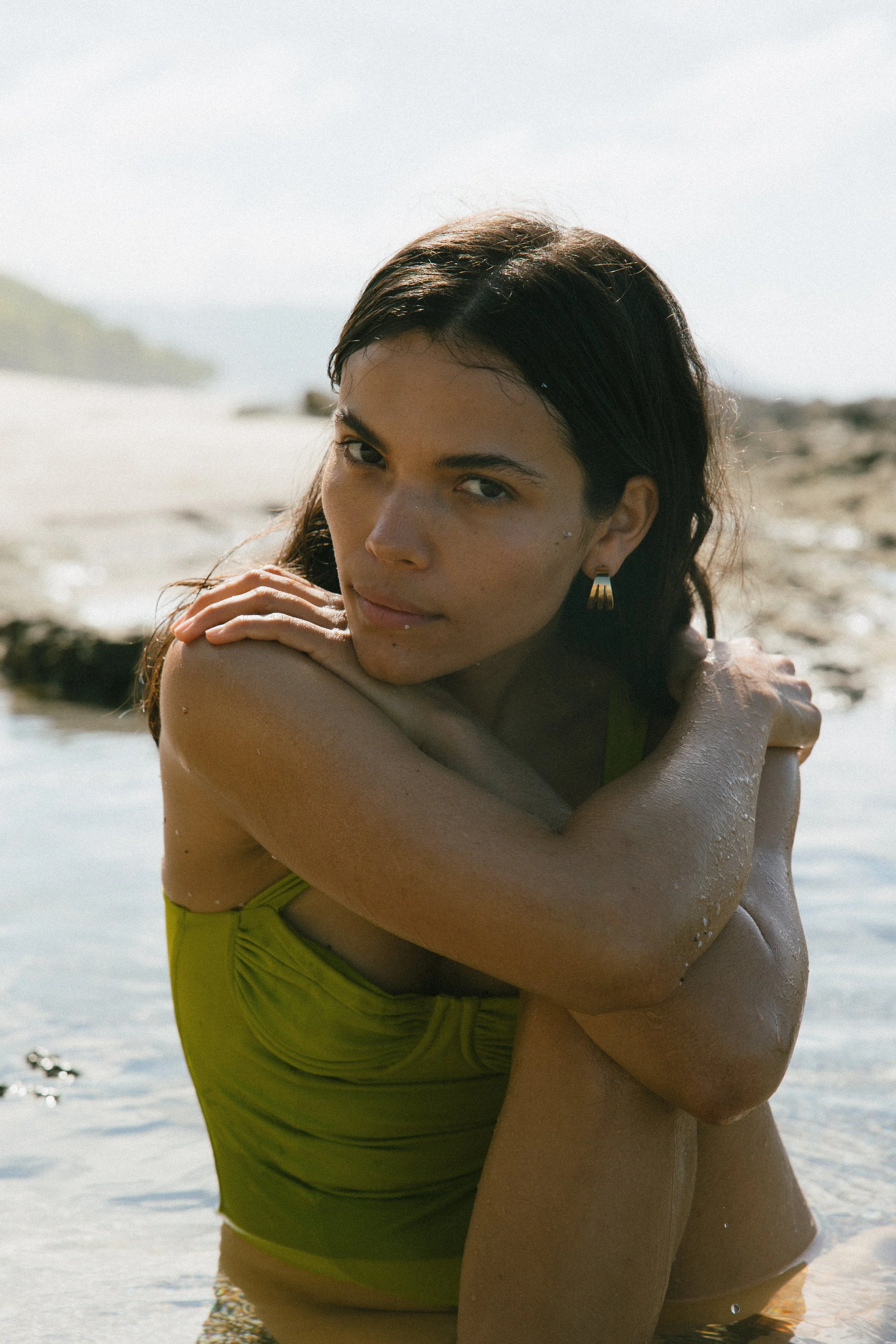 A woman with dark hair and tan skin sitting in shallow water at the beach, posing with her arms crossed over her knees, wearing a green swimsuit, on a sunny day.
