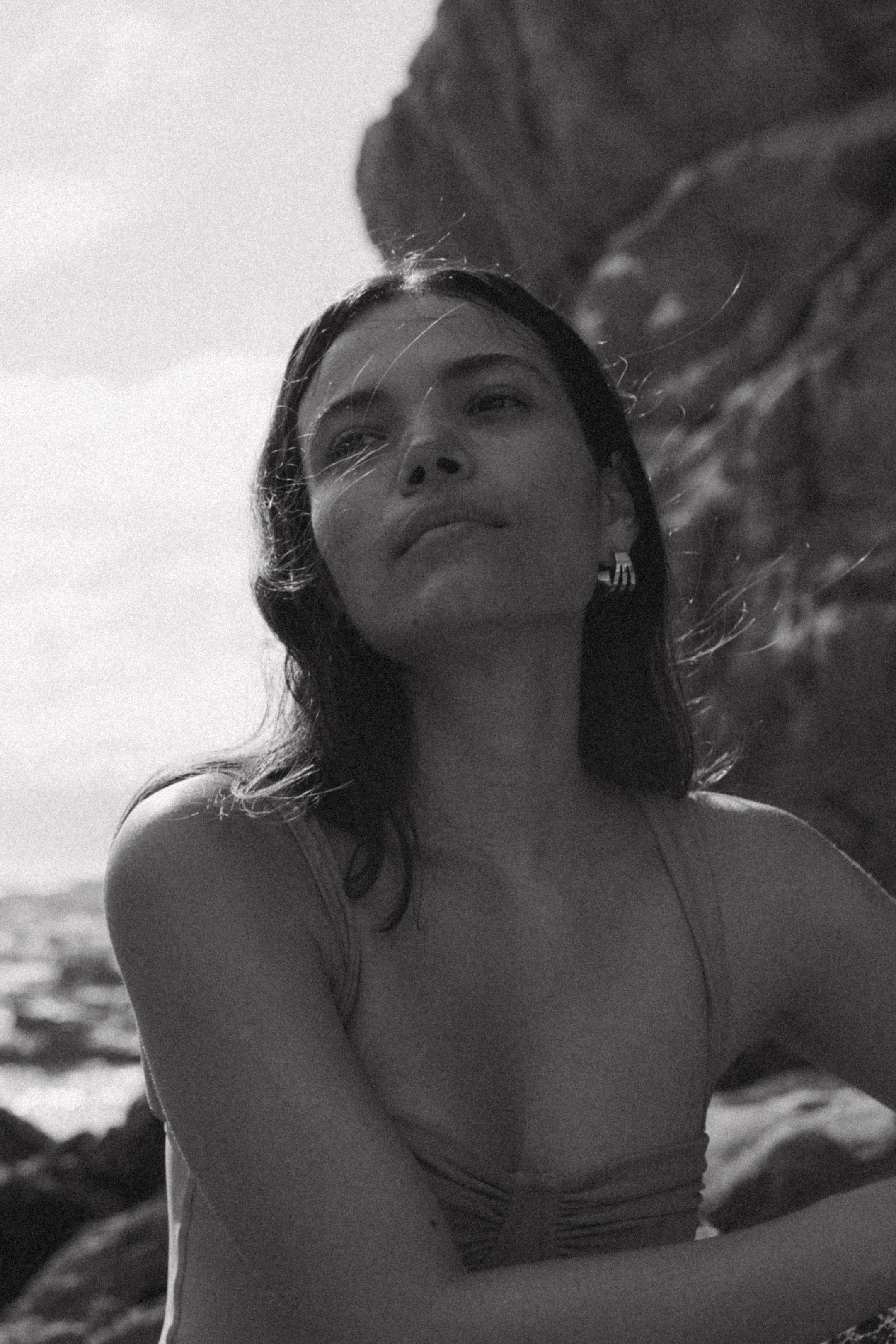 A woman with long dark hair, wearing earrings and a spaghetti strap top, sitting near rocks outdoors, looking up with a calm expression in black and white photograph.