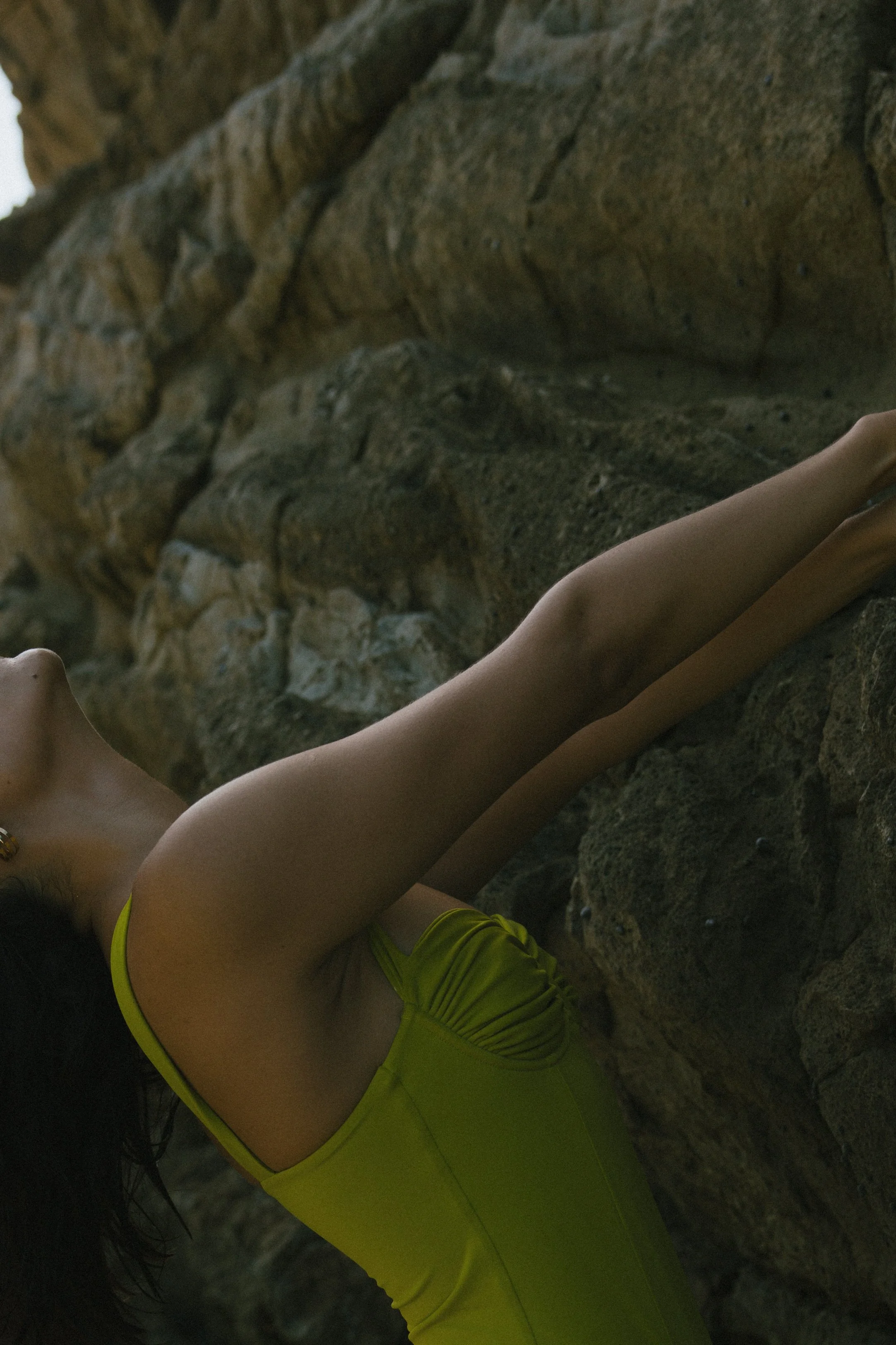 Woman in a lime green swimsuit standing on a rocky beach with trees and hills in the background.
