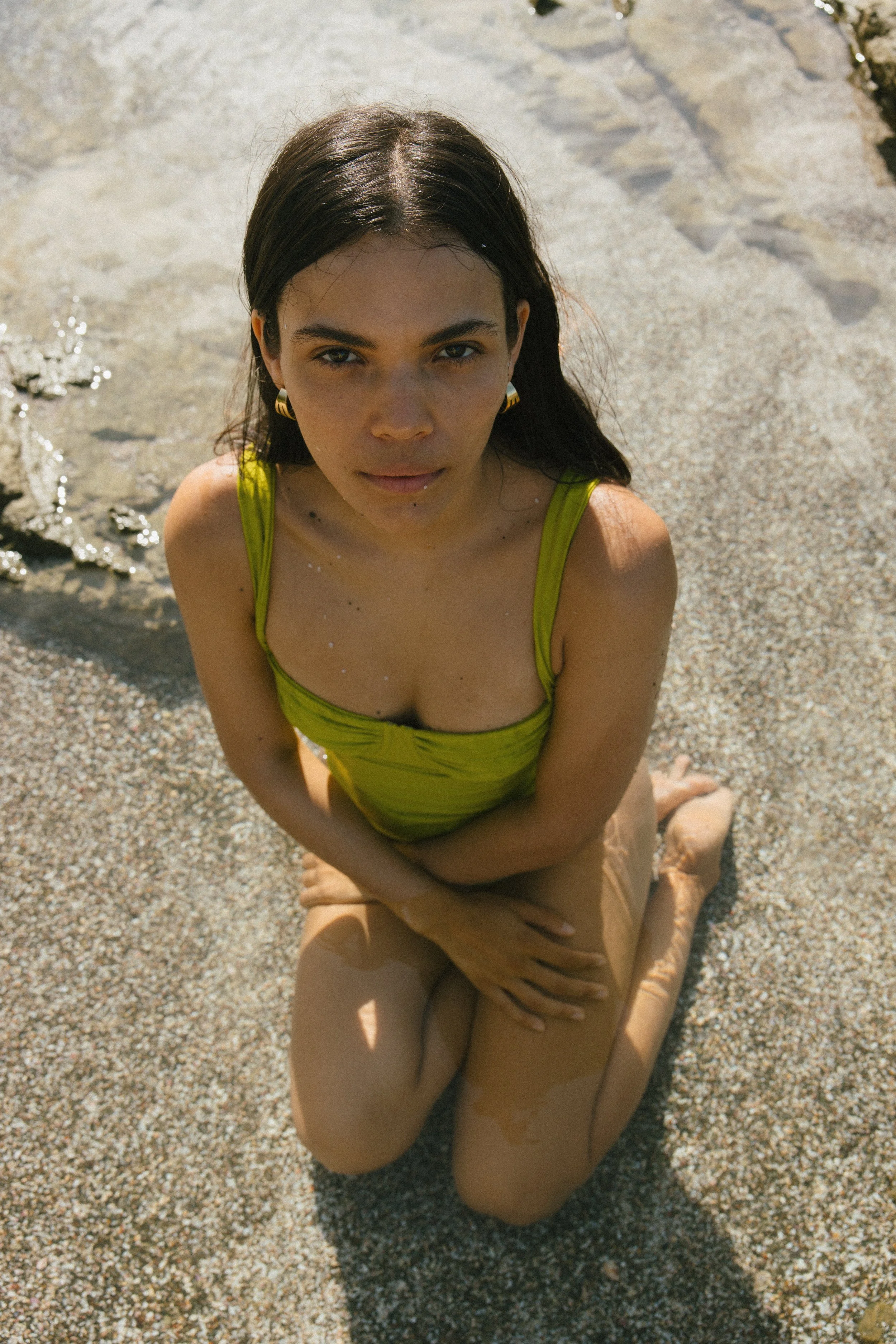 A woman in a green swimsuit kneeling on a sandy beach, looking up at the camera.
