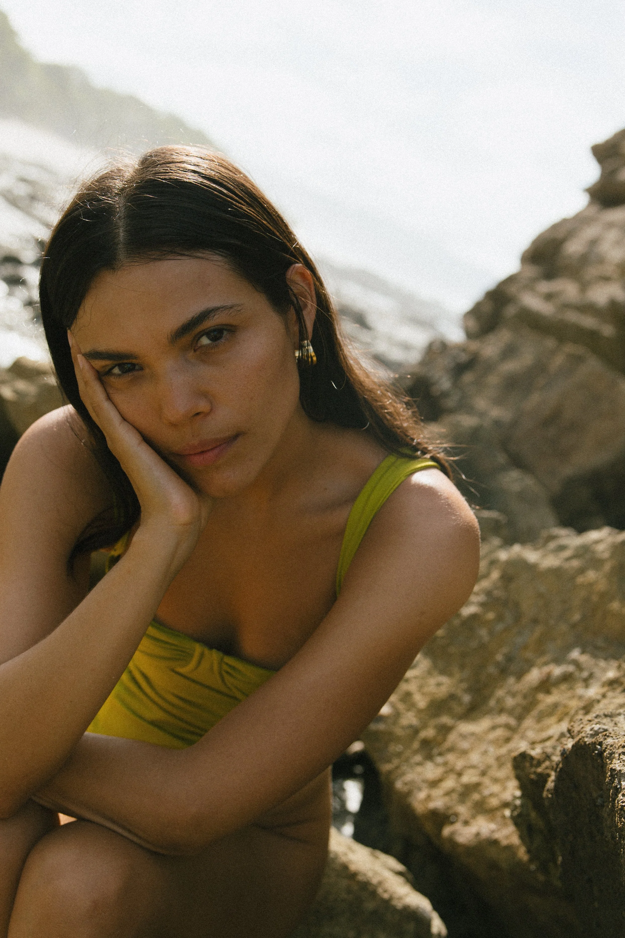 A woman sitting on rocks at the beach, wearing a yellow swimsuit, with her hand resting on her face, looking at the camera.