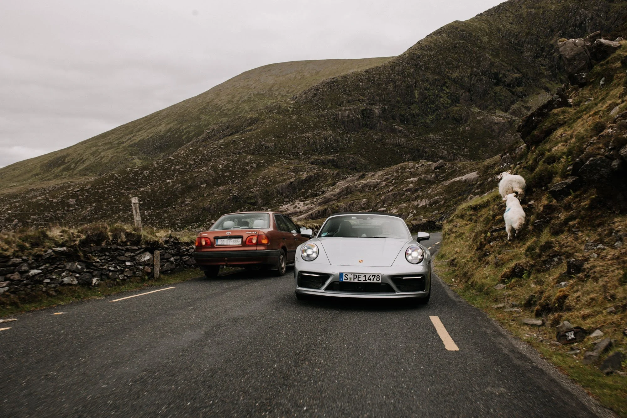 A woman with curly blonde hair standing outdoors near a road in a desert landscape during sunset.