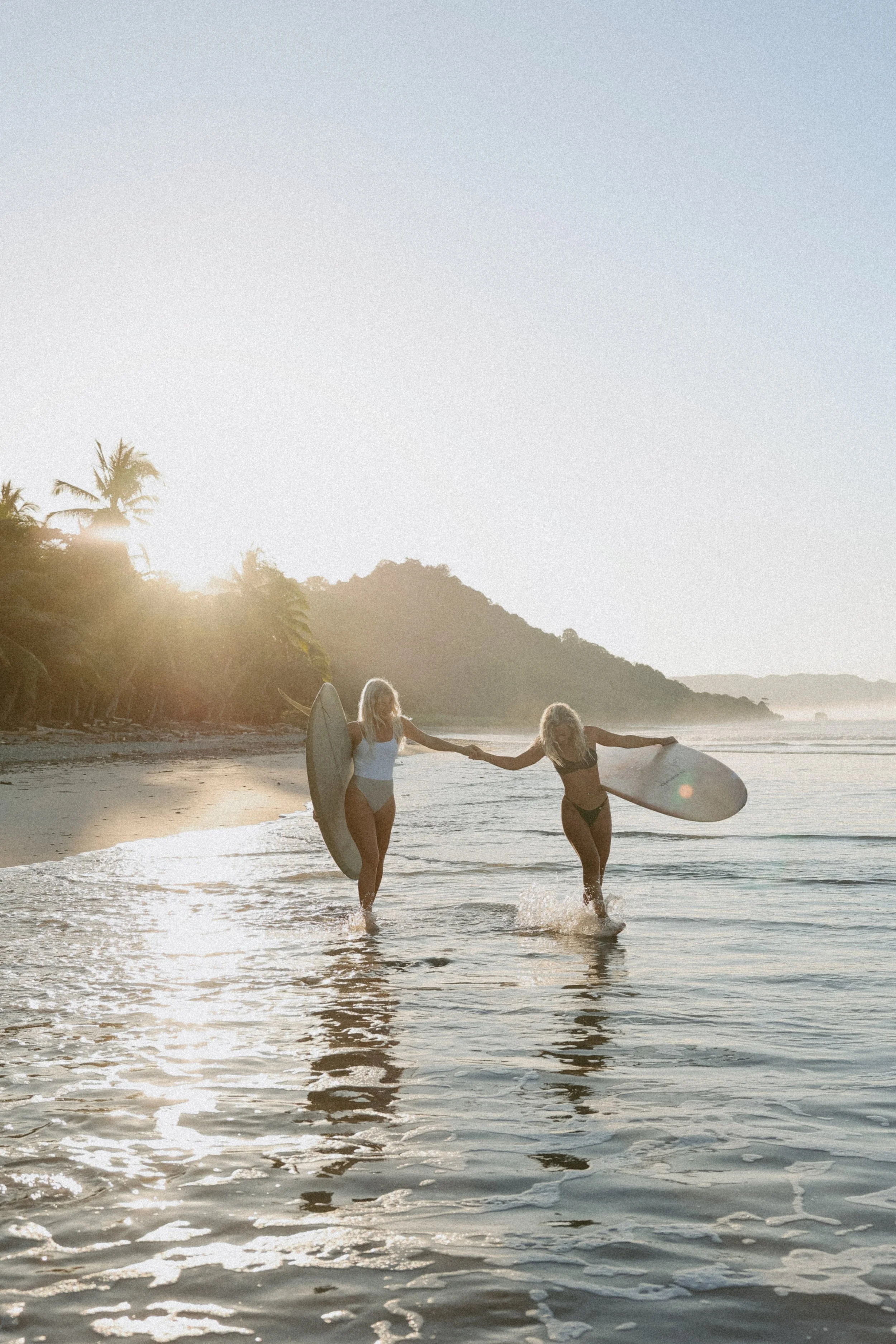 Two women with surfboards walking hand in hand on a beach at sunset.