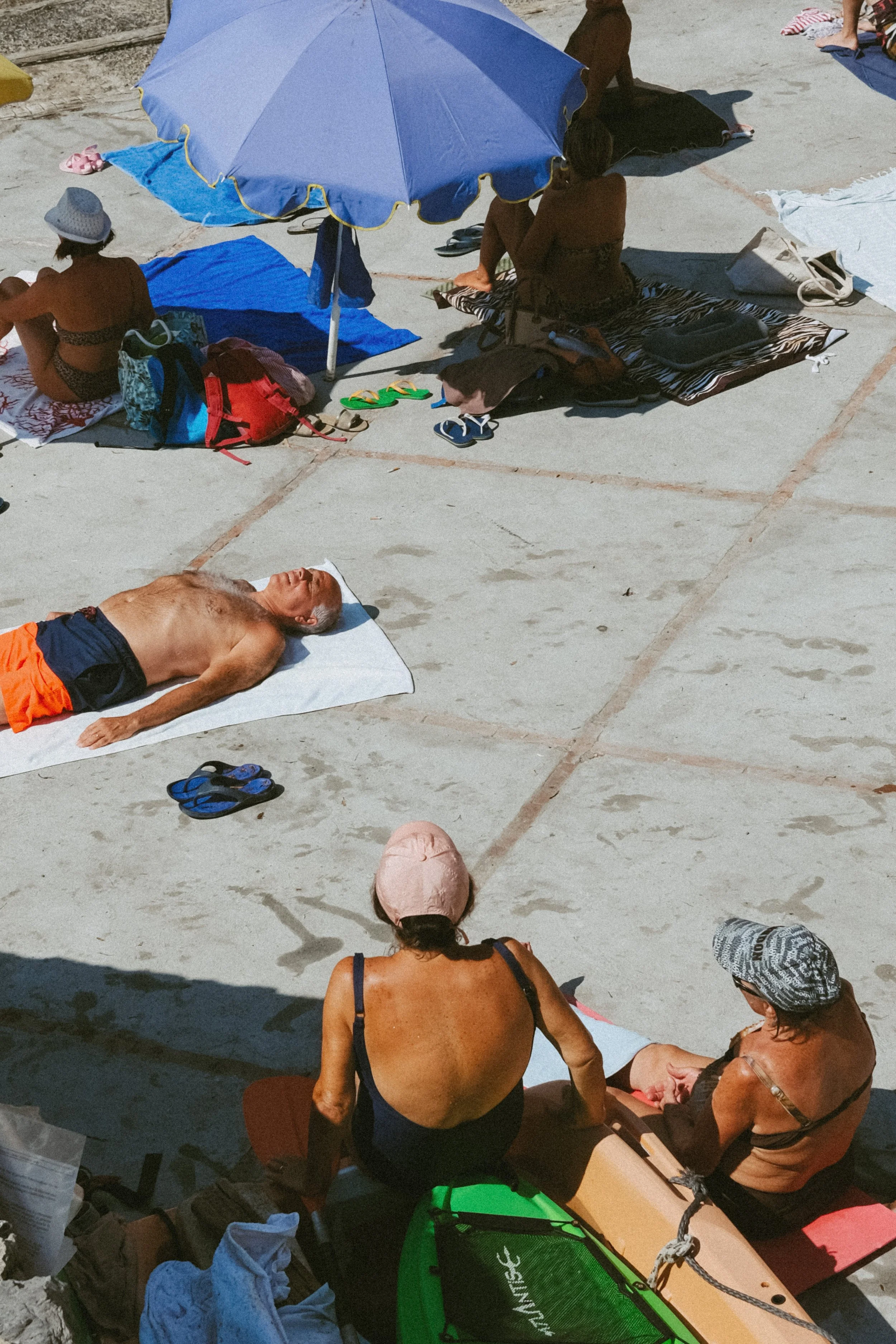 People relaxing on a concrete surface at the beach, with some laying on towels and others sitting under umbrellas in sunny weather.