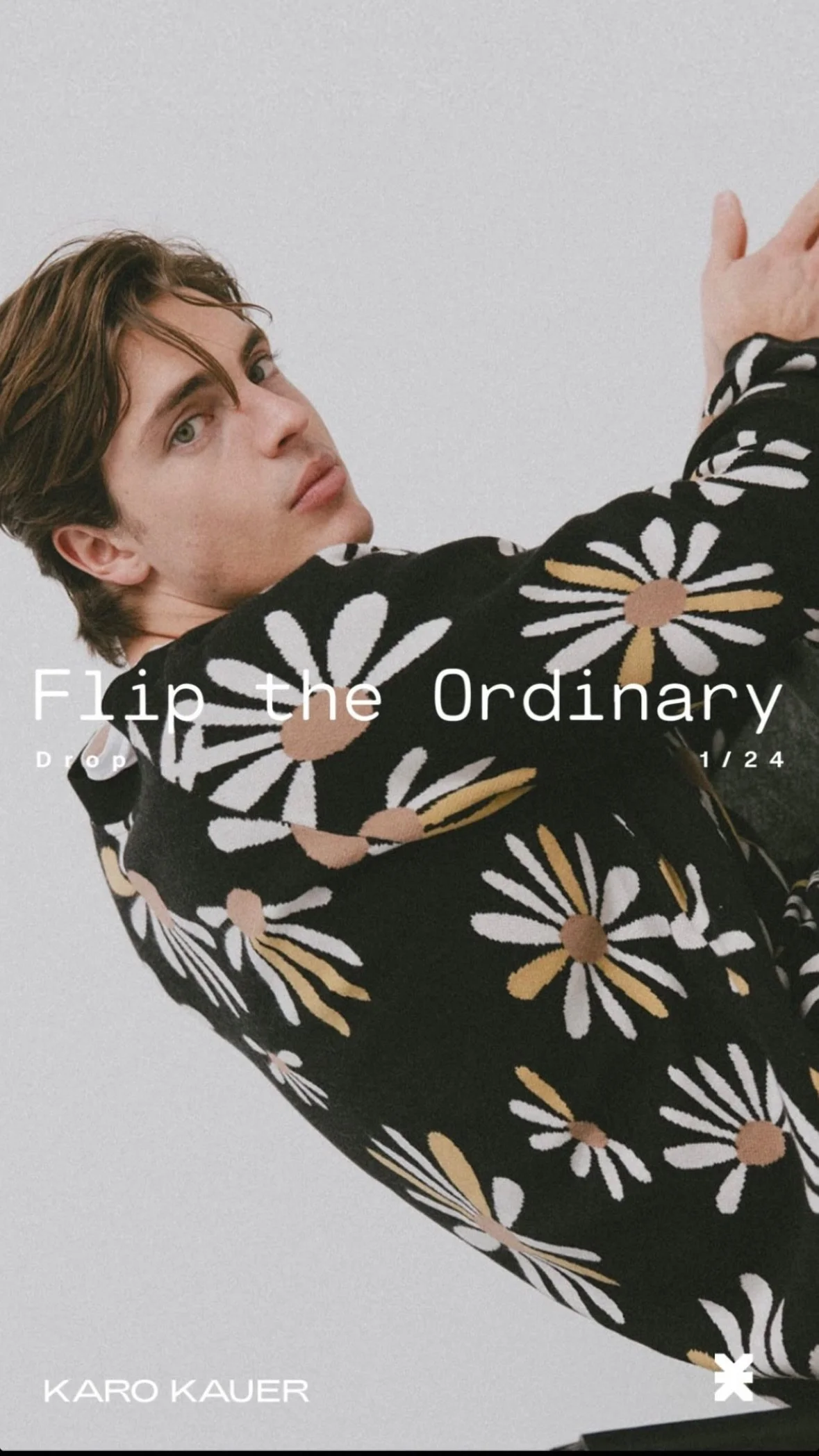 Book cover titled "Flip the Ordinary" by Karo Kauer, featuring a young man with light skin, green eyes, and brown hair, wearing a black sweater with white, beige, and brown daisies, looking at the camera against a white background.