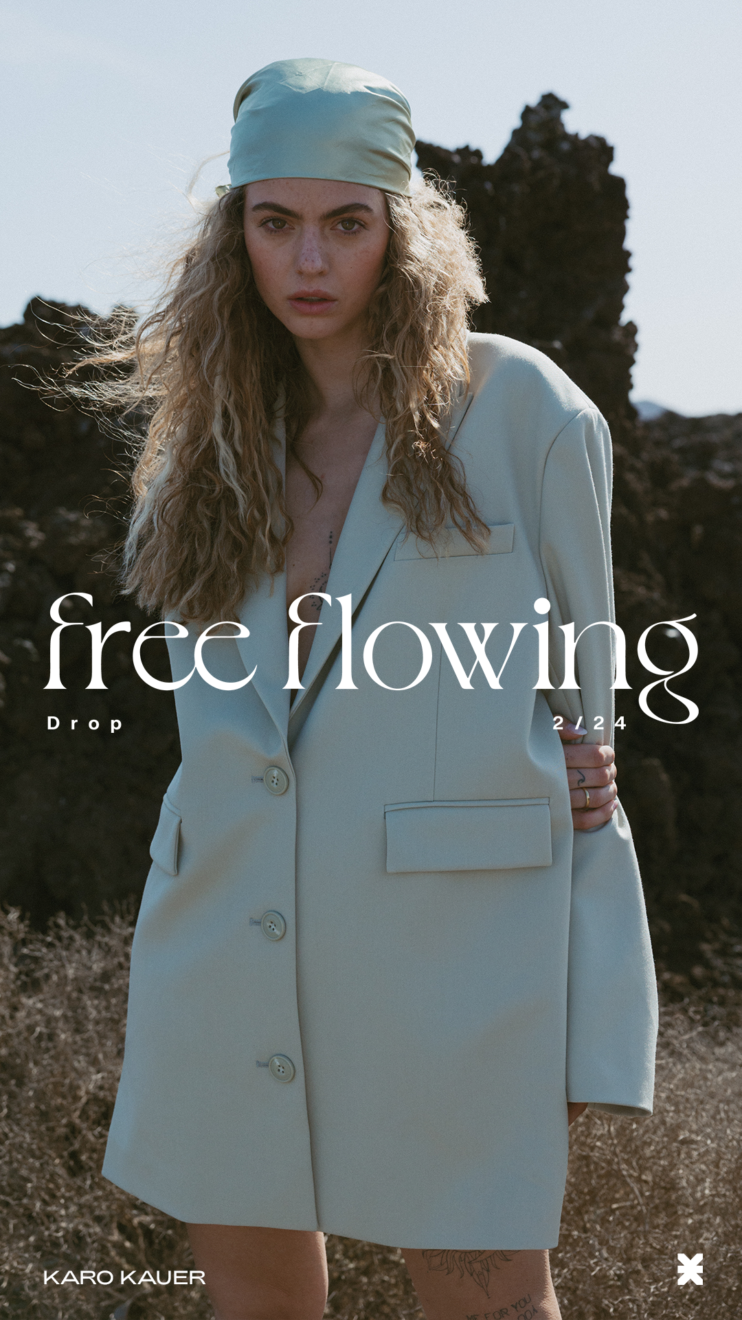A woman with curly hair wearing a light blue headscarf and a matching blazer stands outdoors in front of a rocky landscape. The image features text that reads 'free flowing' and 'drop 2/24' with the name 'Karo Kauer' at the bottom left.