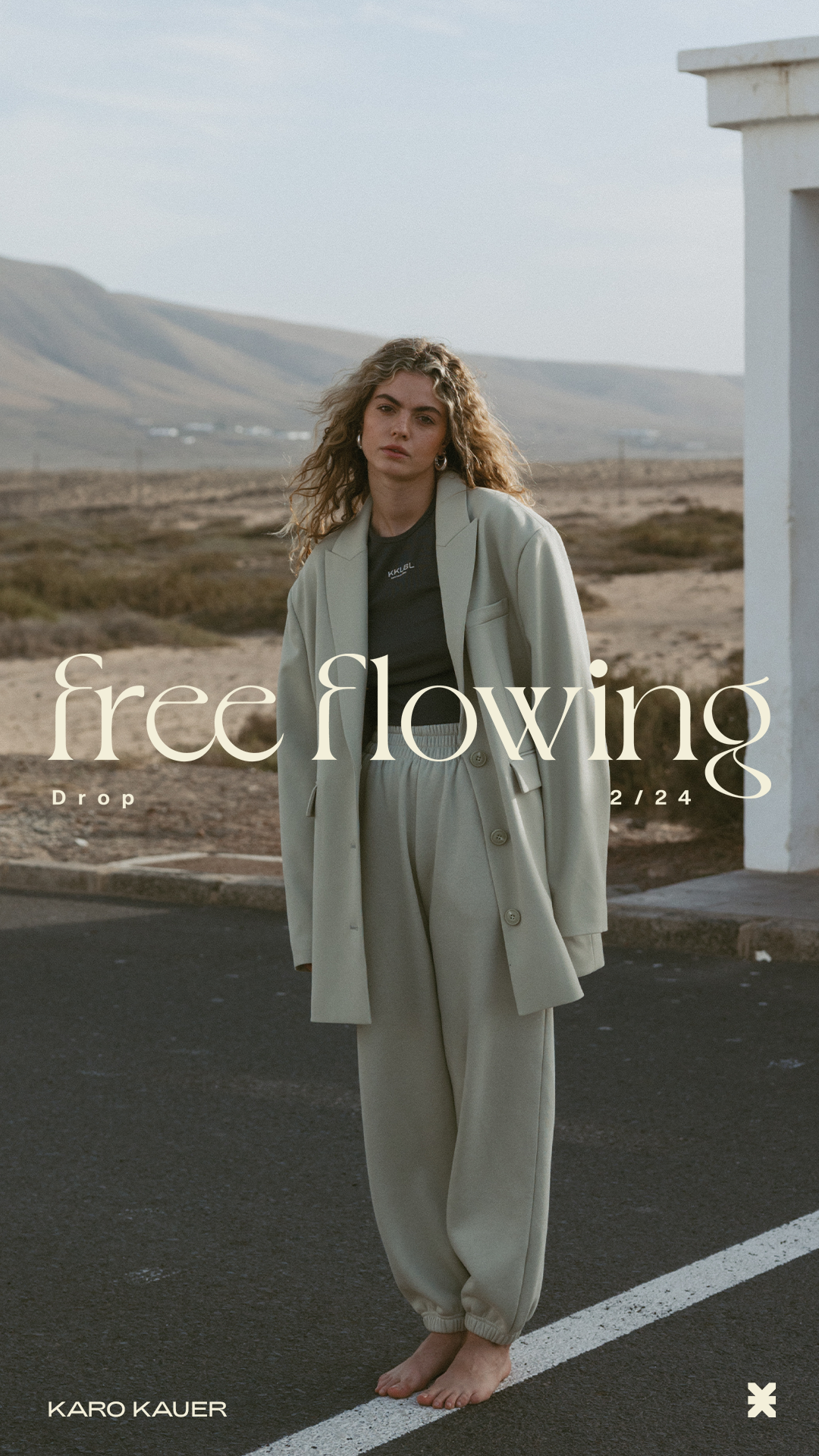 A woman with curly blonde hair standing barefoot on a road in a desert landscape, wearing a beige suit and black t-shirt, looking at the camera. Overlaid text reads "free flowing" and "Drop 2/24".