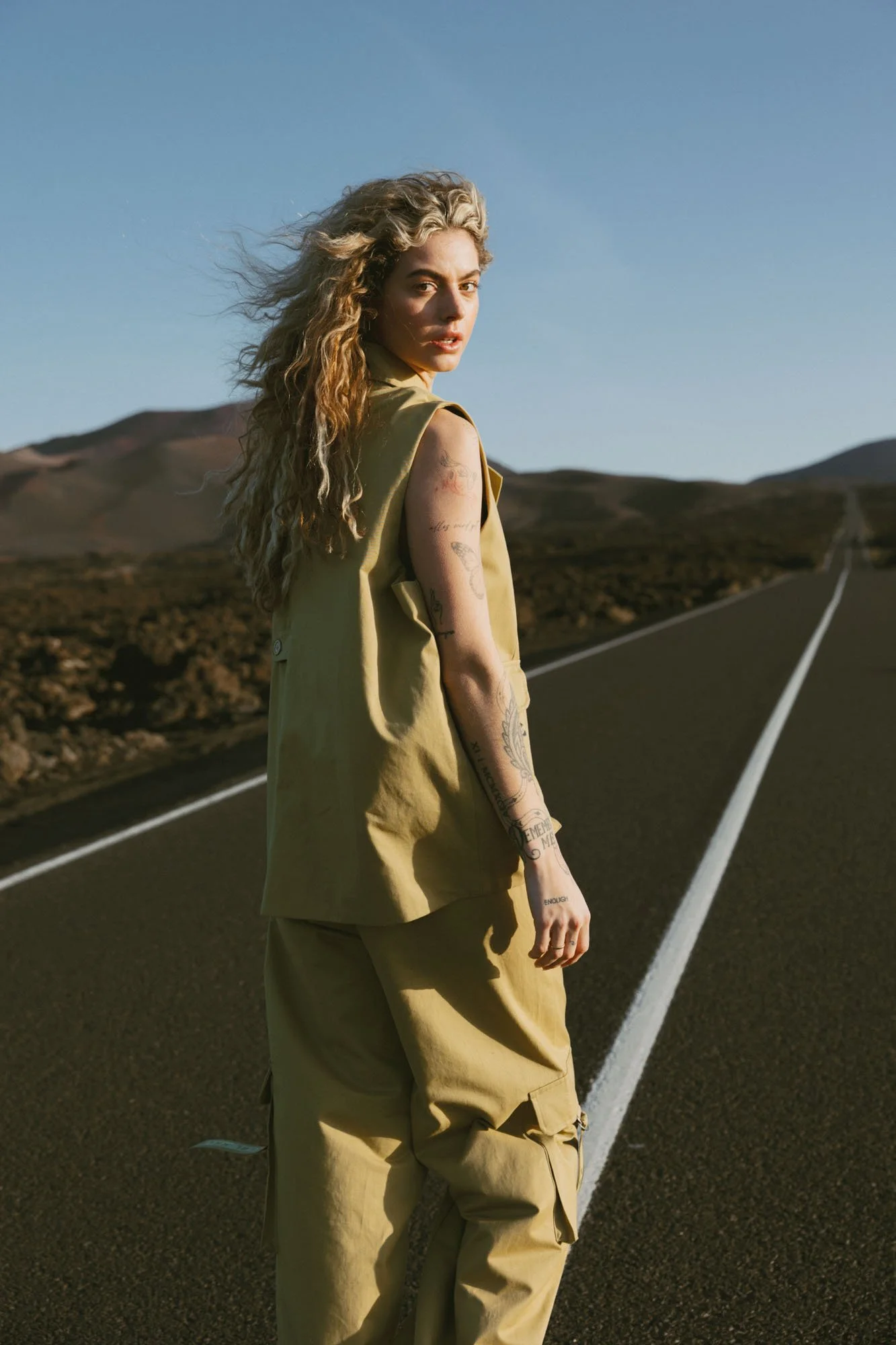 A woman with blonde curly hair and tattoos on her arm stands on an empty road in a desert landscape during daylight, looking over her shoulder.