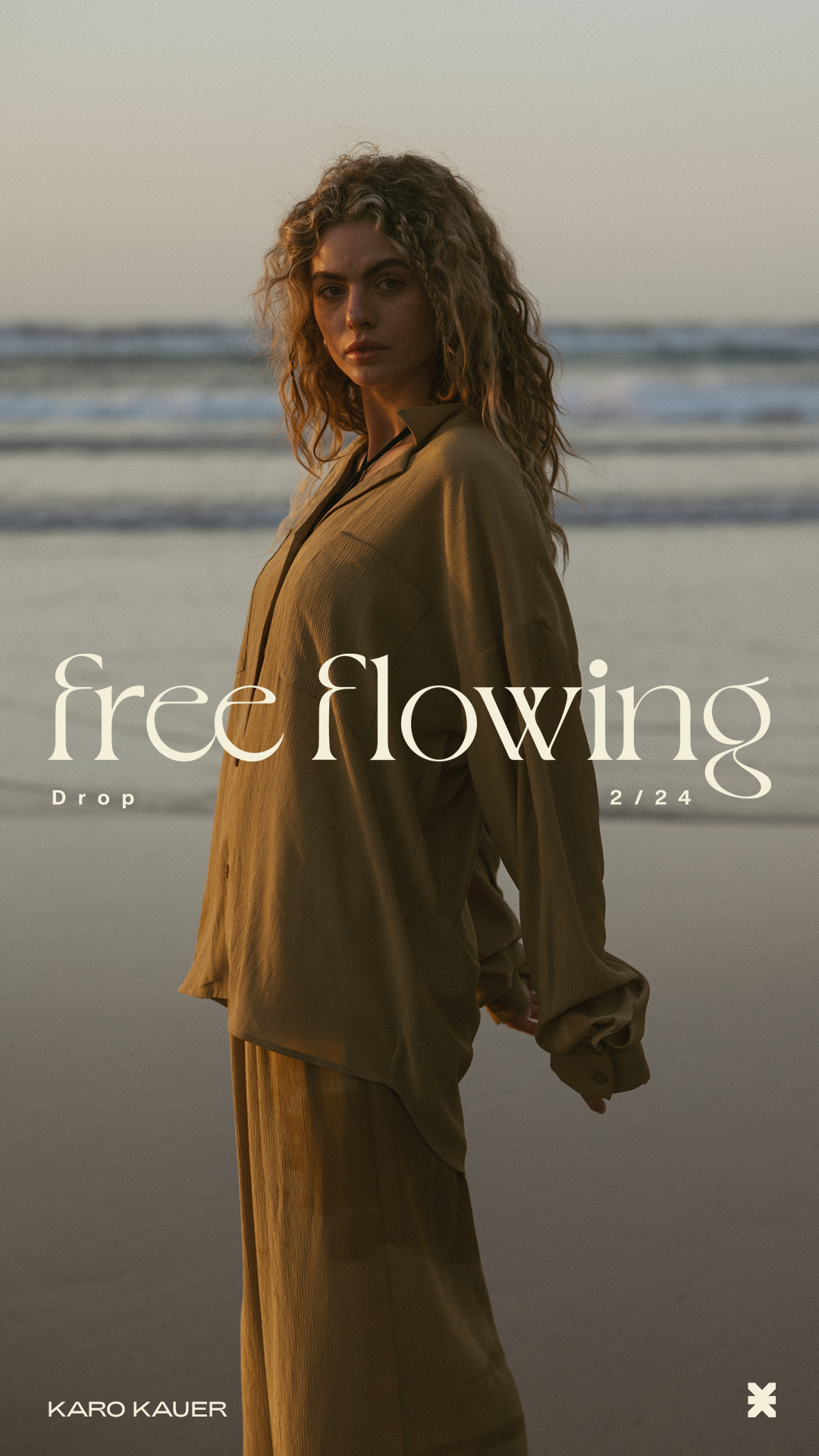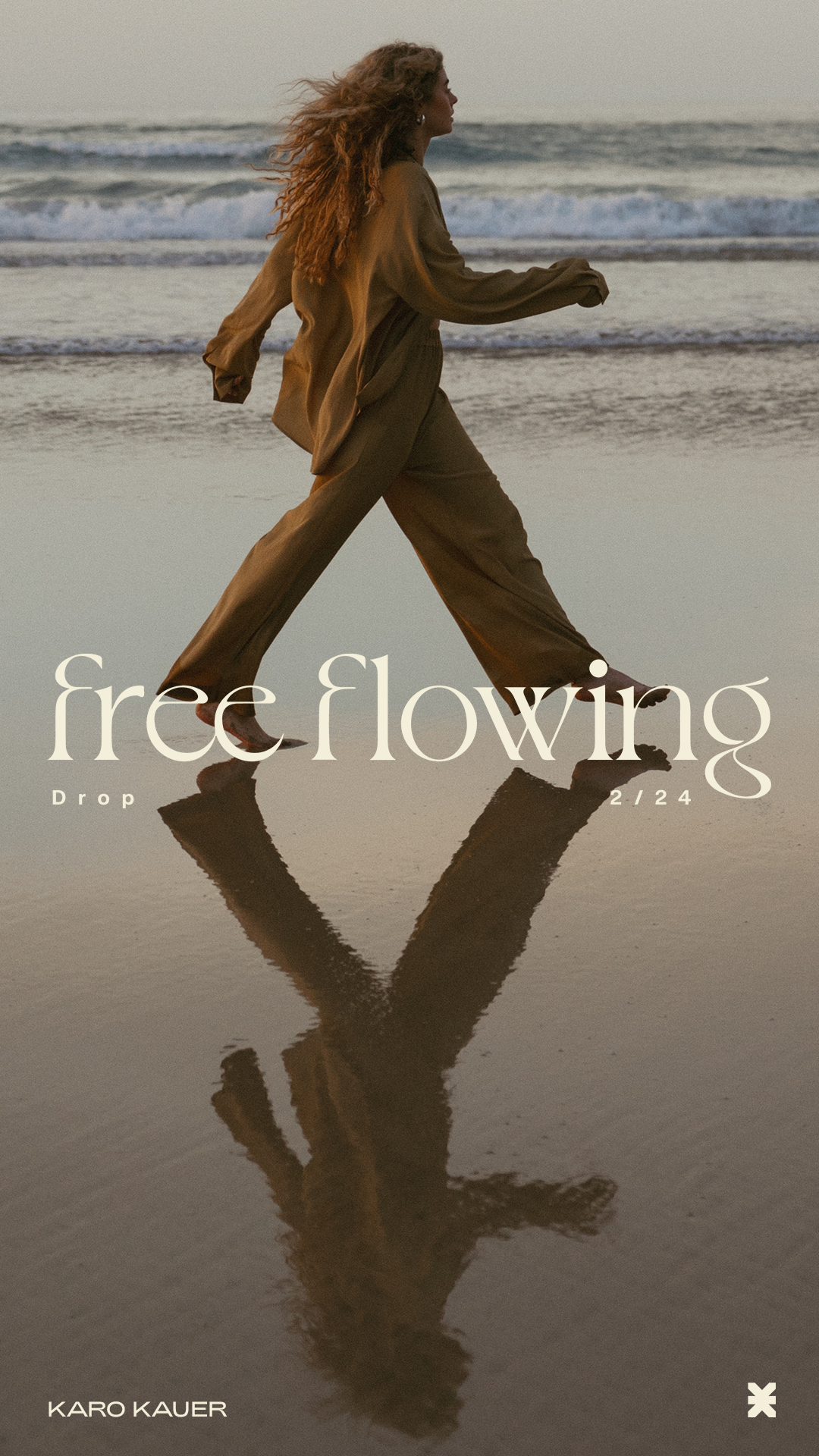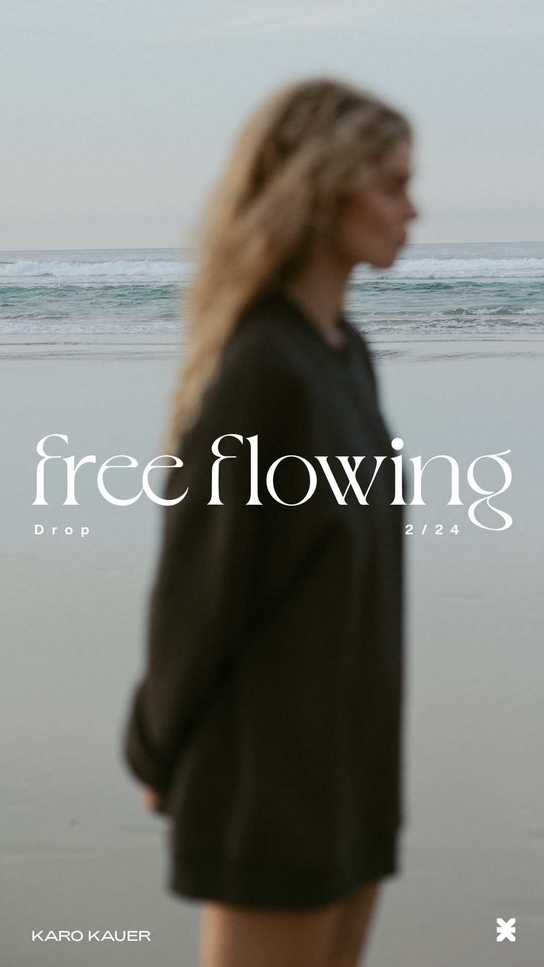 A blurry photograph of a woman with long hair standing on a beach near the ocean, with the words "free flowing" and "Drop" and "2/24" overlaid on the image.