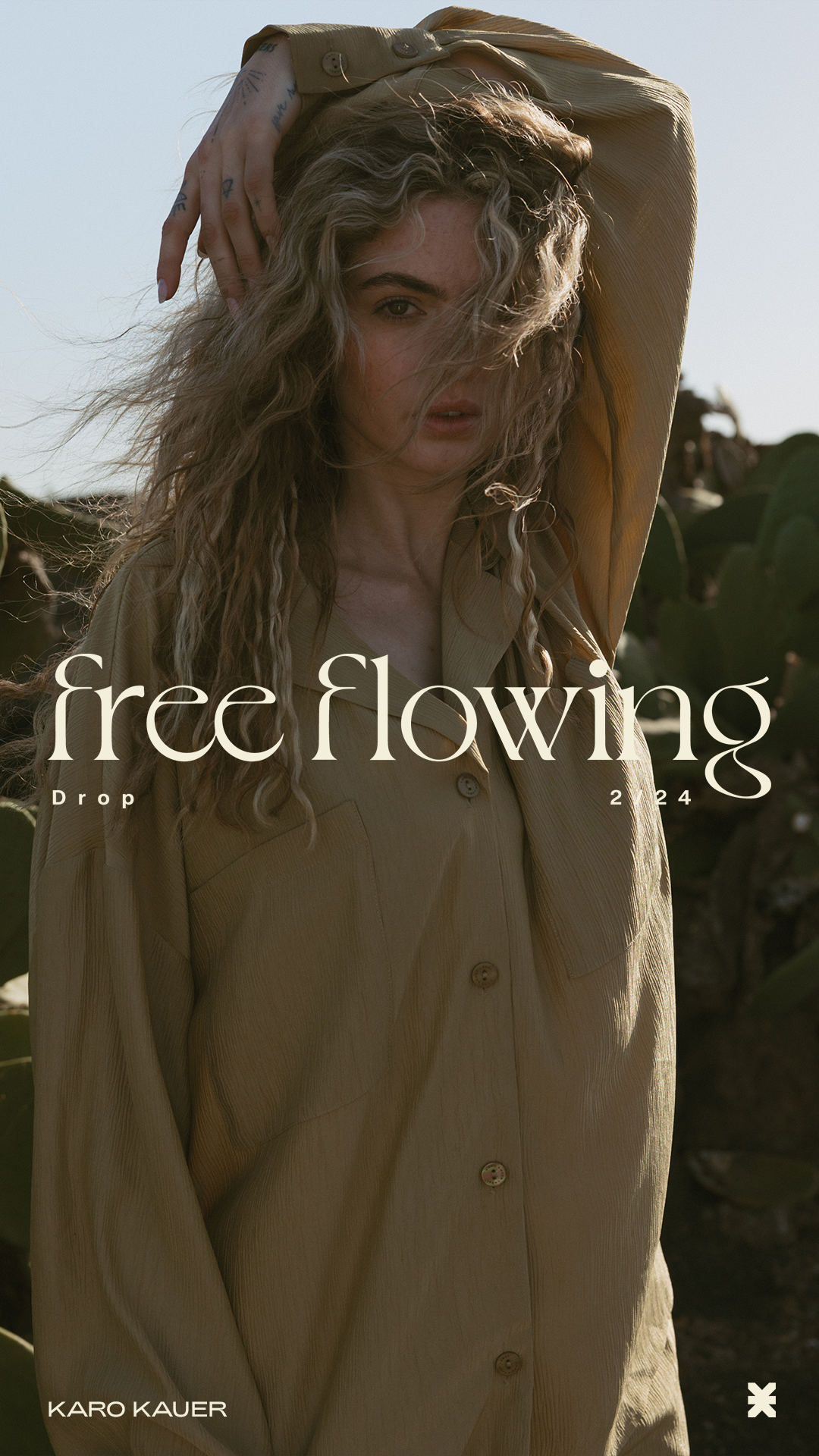 A woman with long, curly hair posing outdoors in front of a cactus, wearing a tan oversized shirt, with the text 'free flowing' overlayed.