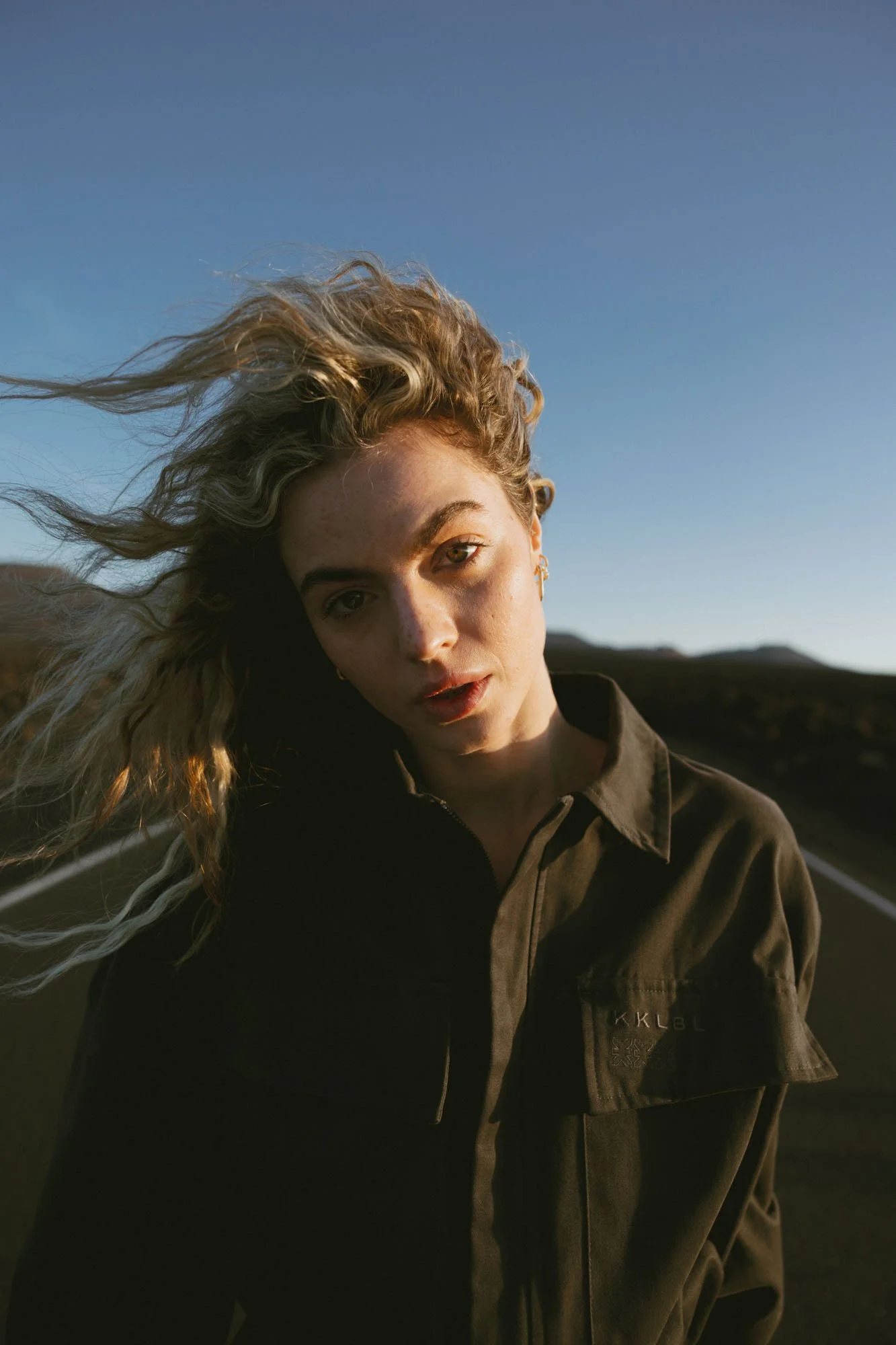 A young woman with blonde, wavy hair standing on an open road during sunset, wearing a dark jacket and looking at the camera.