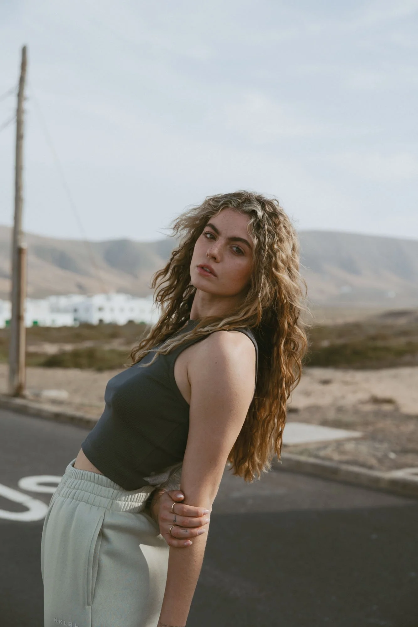 A young woman with long curly hair wearing a black sleeveless top and light-colored sweatpants standing on a road with a scenic landscape of hills and cloudy sky in the background.