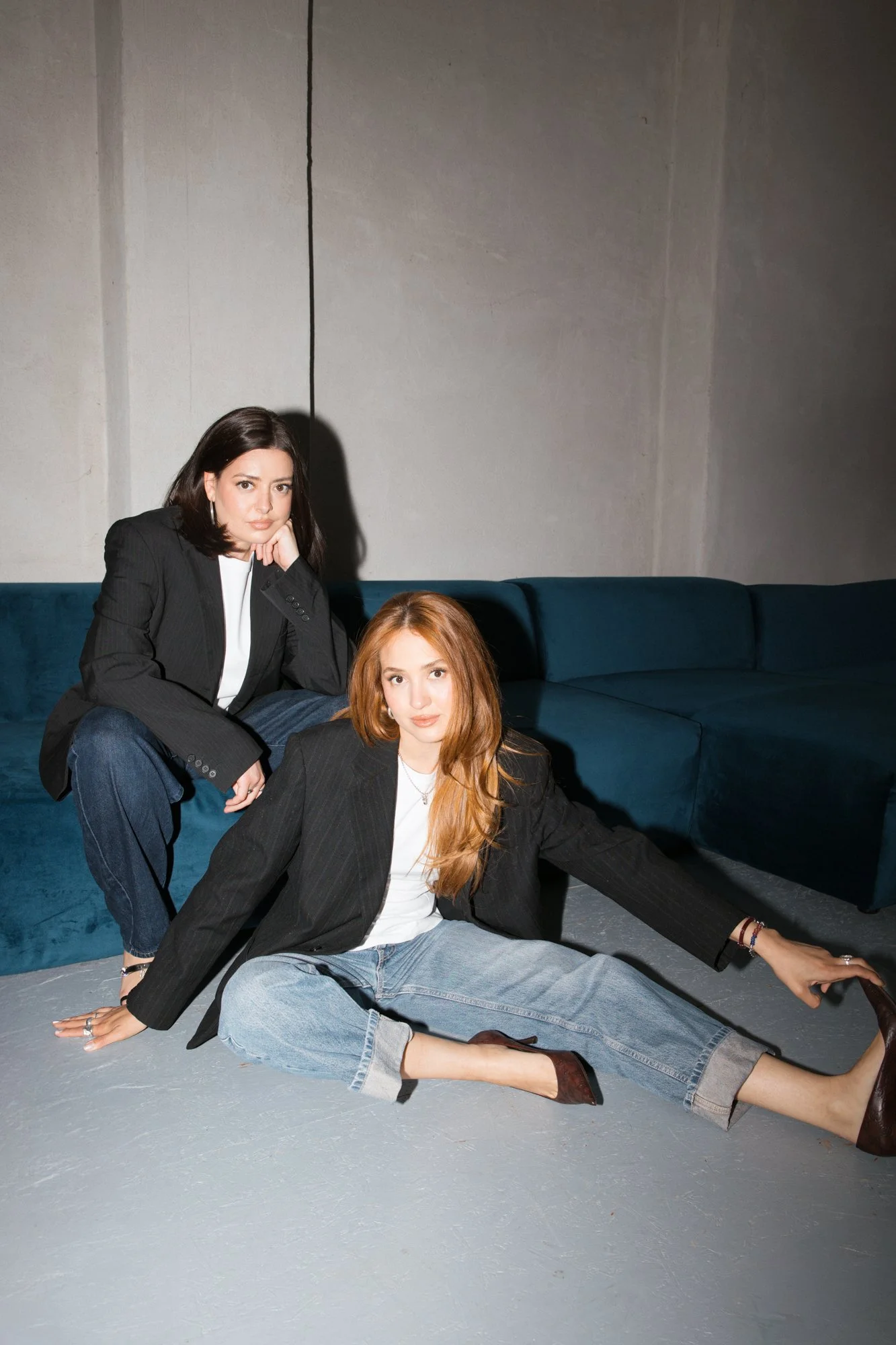 Two women in black blazers and jeans pose in a minimalist room with plain gray walls, one standing and one sitting on a blue velvet sofa.